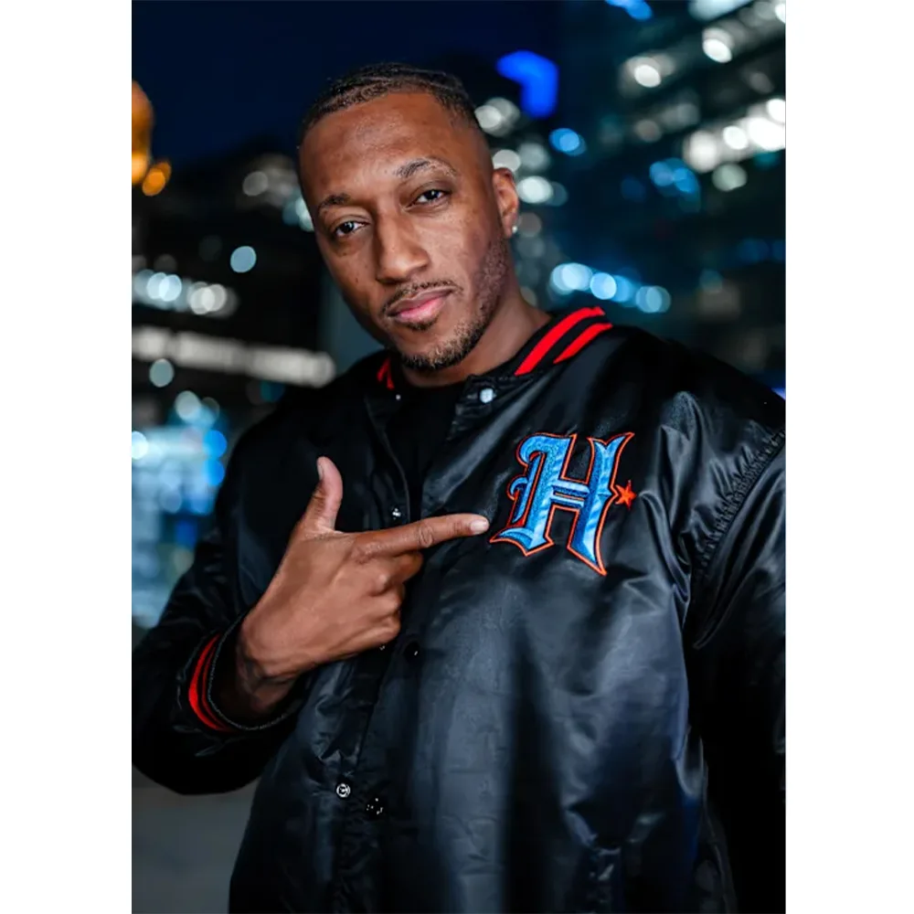The Lecrae Houston Texans Satin Bomber Jacket is the perfect fusion of sports pride and street-style fashion. It’s made of satin, which makes this sleek black bomber very luxurious and bold. The rib-knitted collar, cuffs, and hemline feature striking red stripes that add dynamic contrast to the design. The H emblem on the front is a token of the Houstonian spirit. Meanwhile, the embroidered patch on the bicep adds authenticity to it. Varsity-style charm is further increased with front buttons that close while giving a cosy fit. Whether you cheer for the team or even dress up in streetwear, this jacket belongs to every pure Texan who’s a proud fan. With its perfect blend of sporty and trendy, this bomber jacket makes a powerful statement wherever you go.