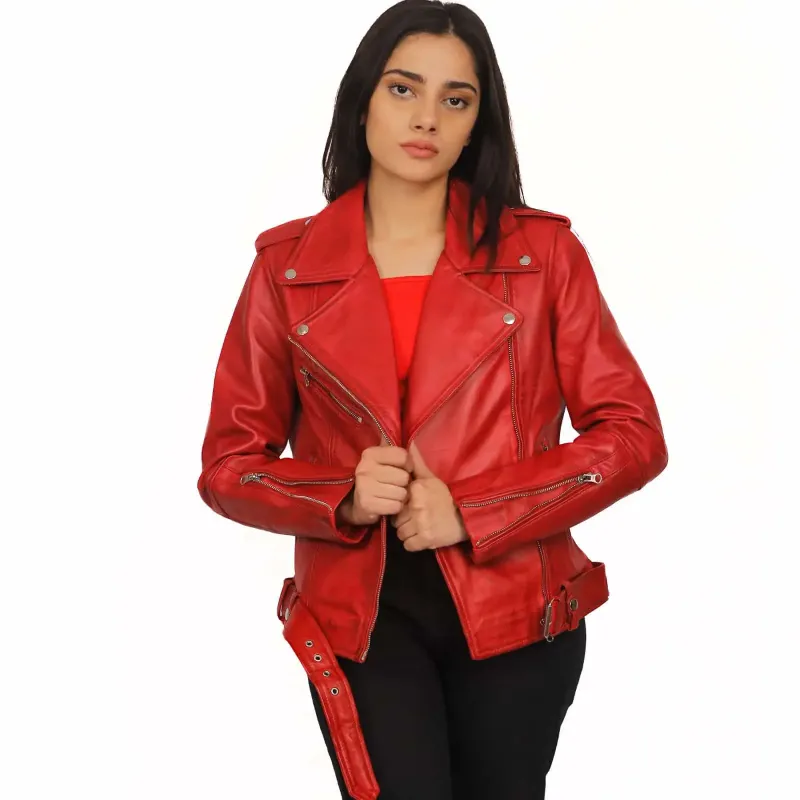 Embrace the classic appeal of our Women’s Red Leather Biker Jacket, a perfect complement to any outfit. This iconic piece, which was created with unrelenting accuracy and attention to detail, easily combines elegance and usefulness, making it a must-have staple for everyone who is fashion-forward. Featuring an iconic asymmetric zipper fastening, pockets with zippers and cuffs, and an additional belt adorned with shimmering silver hardware, our jacket radiates a carefree elegance that surpasses fashion trends. Our leather outfit is a fitting representation of the long-standing symbolism of power, individualism, and revolt.