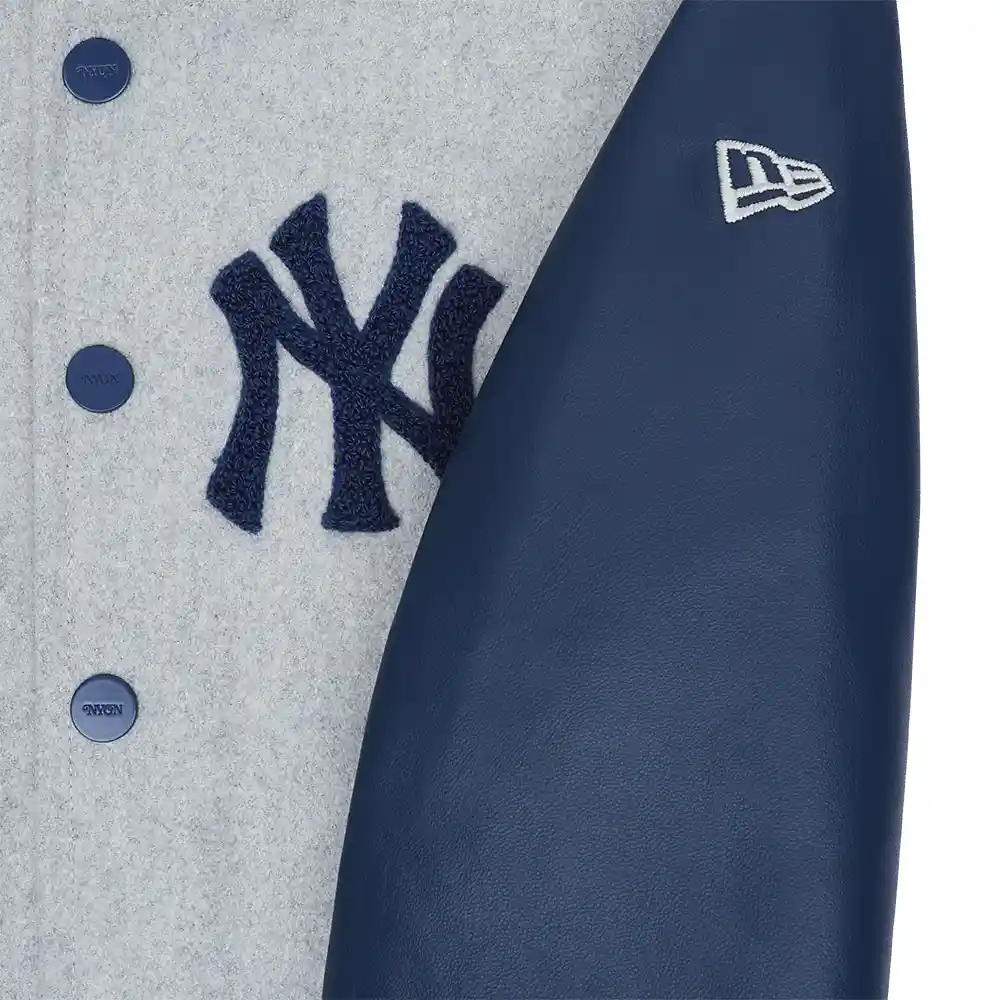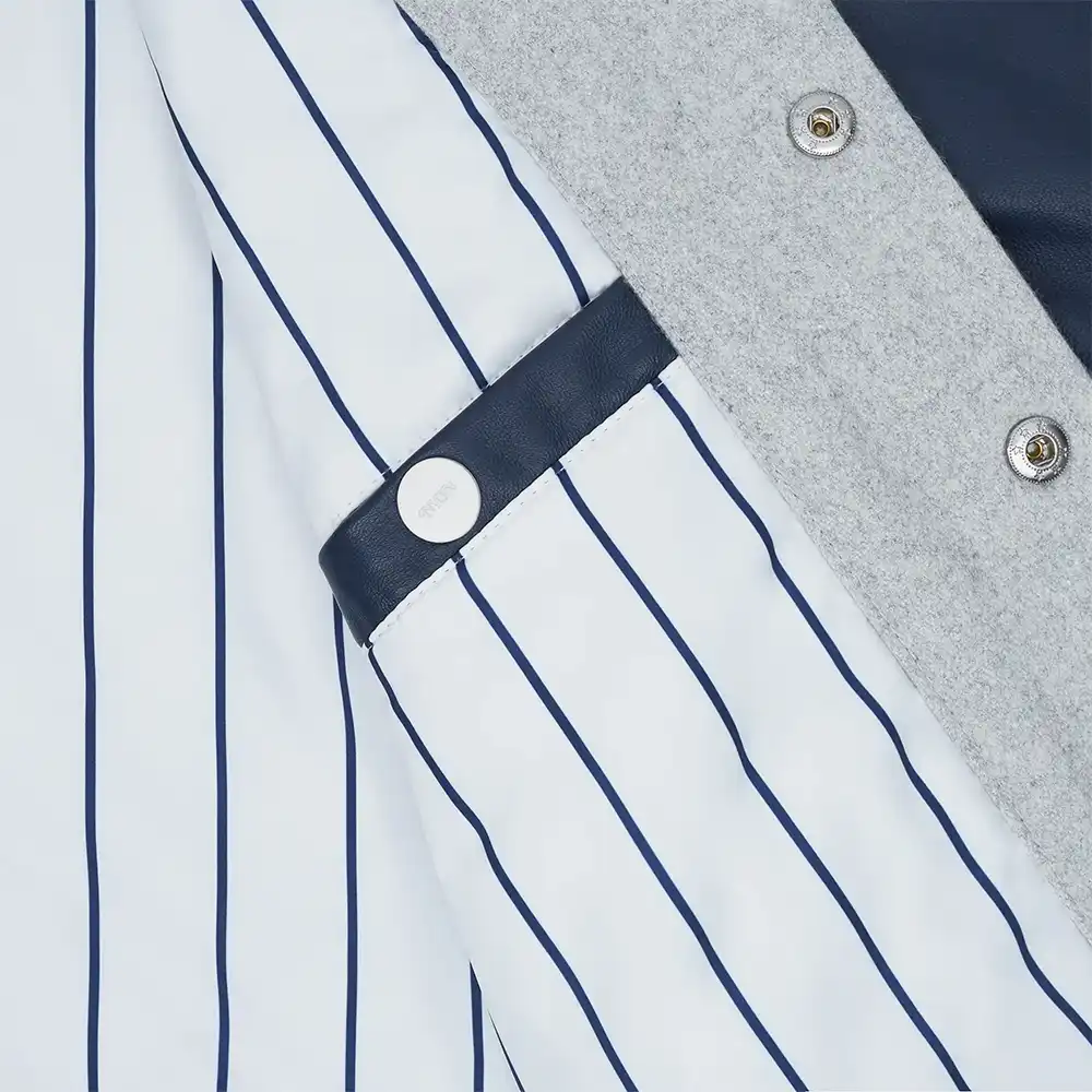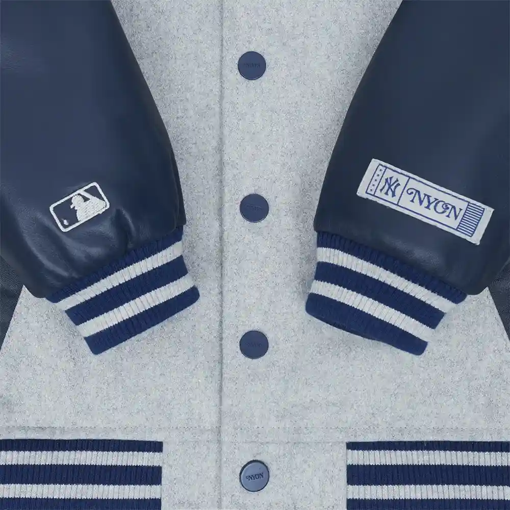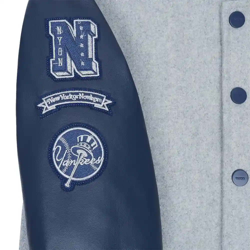 Step into the world of games in our New York or Nowhere Gray Satin Full-Zip Jacket. It is designed for baseball enthusiasts who admire bold fashion. This jacket combines a woolen body with show-stopping blue leather full-length sleeves. It has a varsity feel due to the rib-knitted collar, cuffs, and button closure, as well as being warm and cozy with its polyester lining. Embroidered logo elements on the front express your Yankee’s pride with class. Whether in New York or elsewhere, this jacket allows you to bring the spirit of the Yankees along wherever you are.
