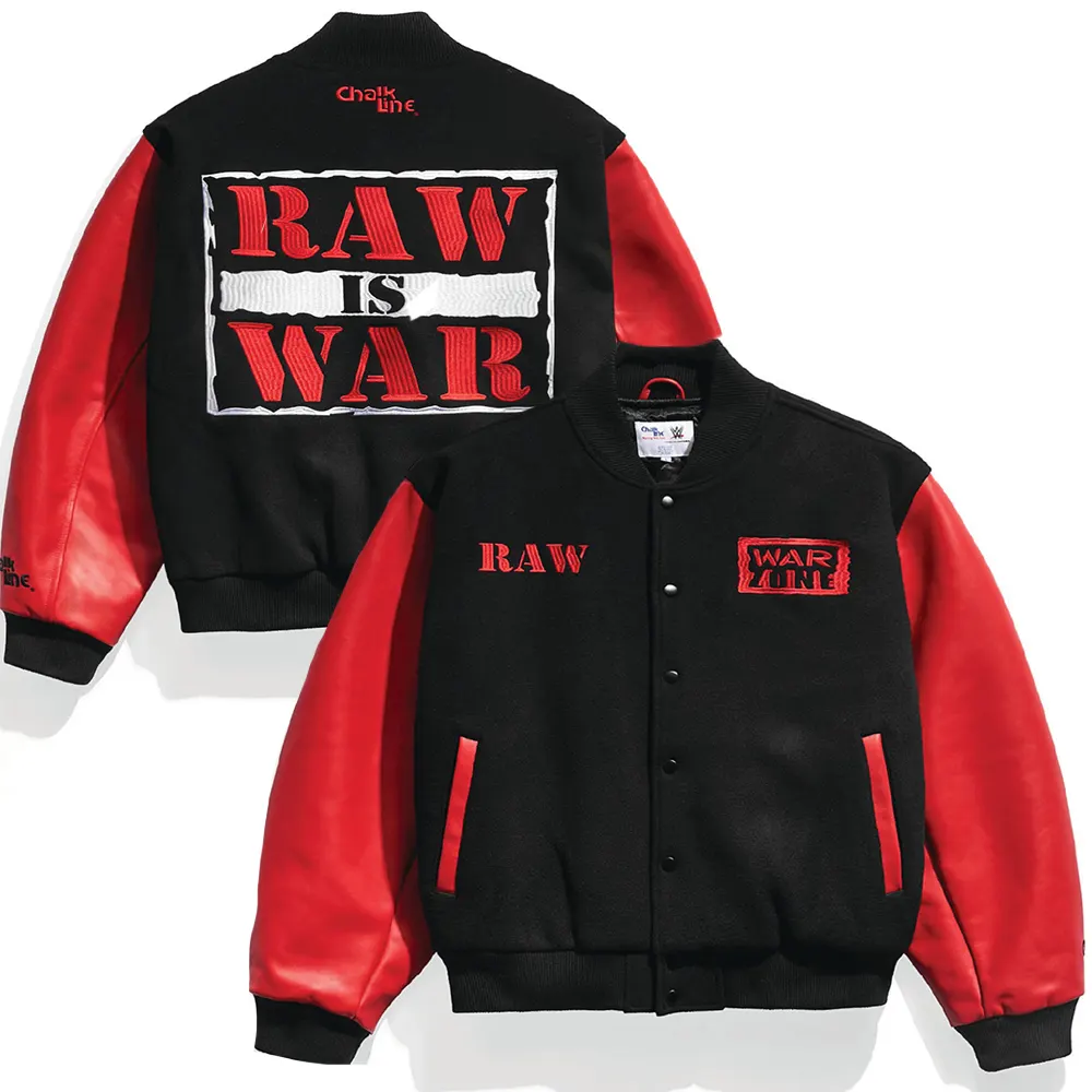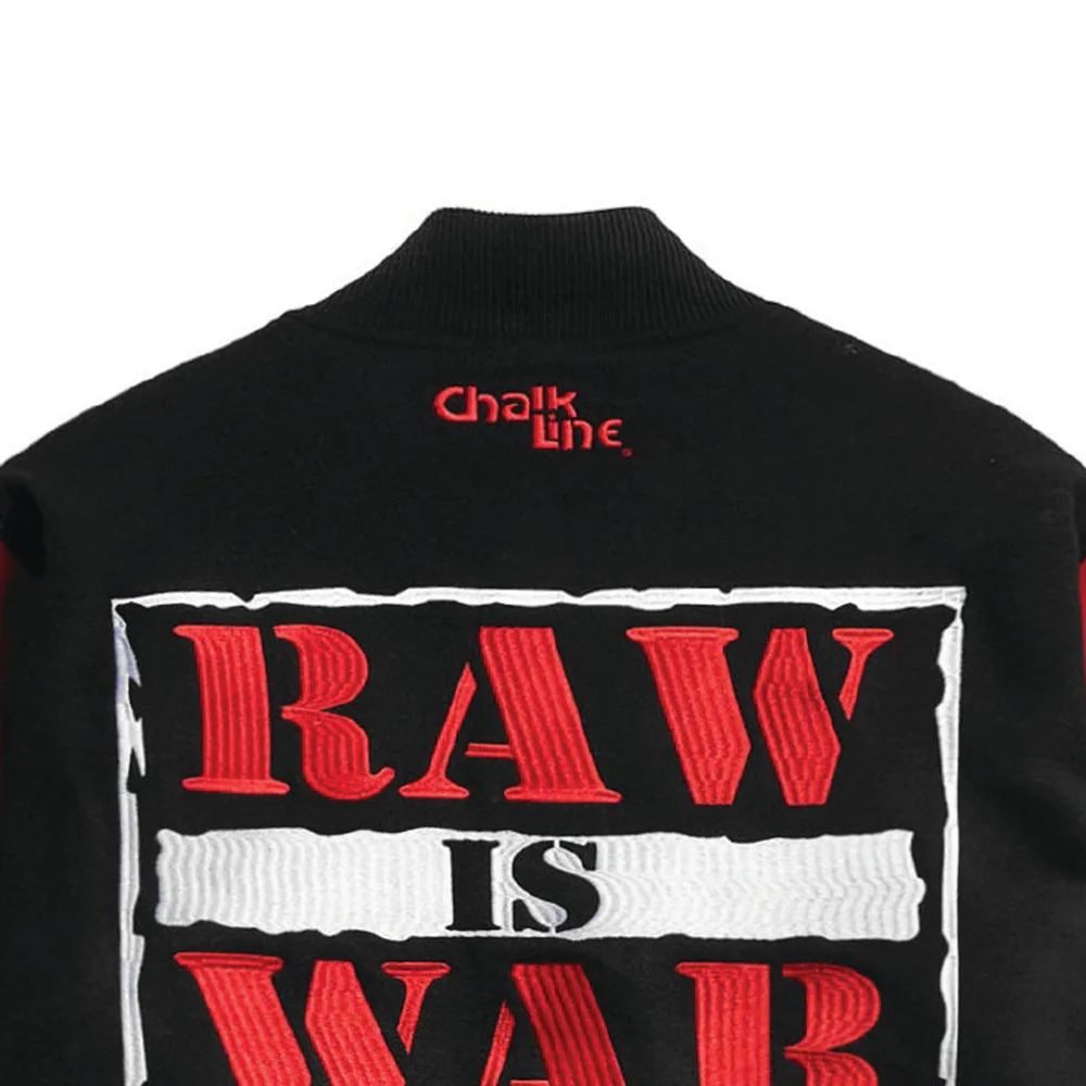 Black & Red Raw Is War Retro Wool With Leather Letterman Jacket embodies strength, tradition and attitude. Designed for wrestling fans and vintage fashion lovers, it captures the excitement and nostalgic energy of the 1990s WWE Raw era. The rib-knit cuffs and hemline allow the jacket to fit comfortably while maintaining its shape for a long time. However, the leather long sleeves contrast sharply with the wool body of the jacket, creating a vibrant, dynamic look that makes a statement. Moreover, the jacket includes two outer and one inner pocket, offering storage and utility. This jacket flawlessly blends sporty aesthetics with cultural nostalgia, making it an instant classic.